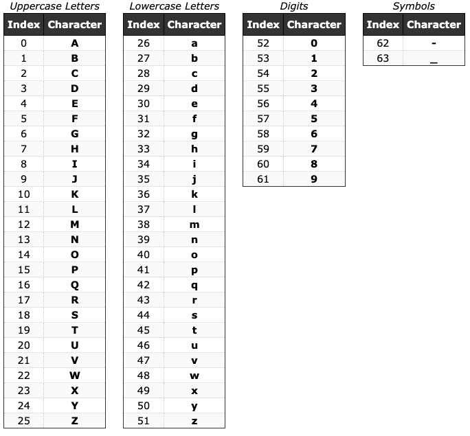 Base64에서 의도와 다르게 동작할 수 있었던 62, 63번 인덱스인 '+'와 '/'가 '-'와 '_'로 변경된 걸 볼 수 있습니다.