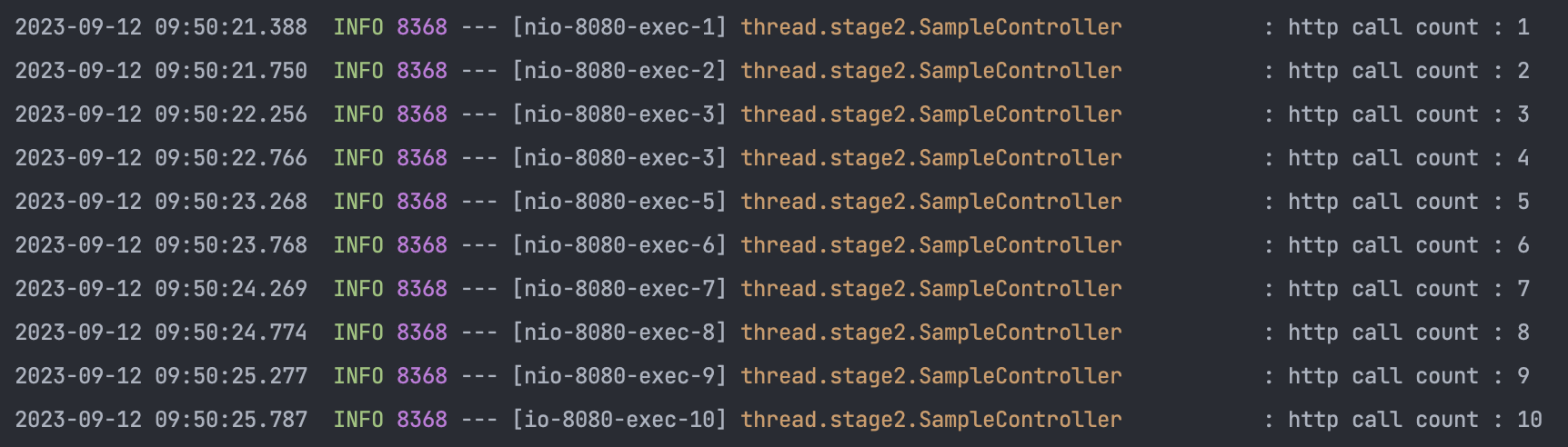 새로운 스레드가 생성되어서 10개의 요청이 모두 처리되는 것으로 보입니다!