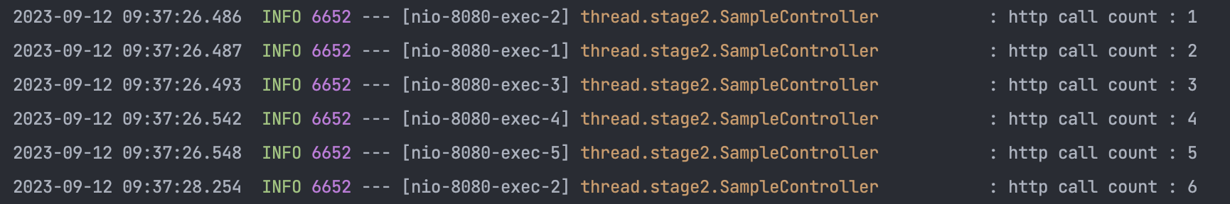 threads.max는 5이기 때문에 5번 요청 이후에는 스레드를 생성하지 않고 스레드 풀의 1~5 스레드를 재사용하는 것을 알 수 있습니다.