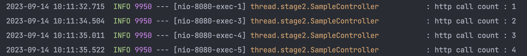 sleep 시간이 적기 때문에 '동시에' 요청이 오는 것으로 판단하는 것으로 보입니다.