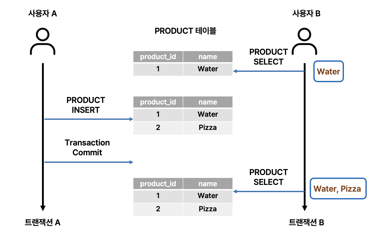 4. 트랜잭션 B에서 PRODUCT 테이블의 모든 PRODUCT SELECT : Water, Pizza