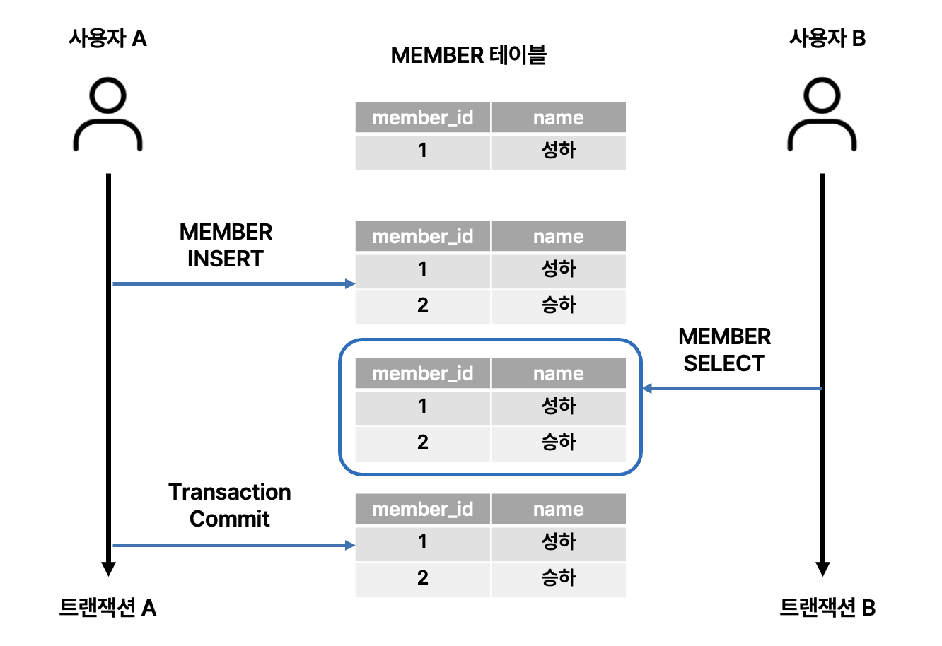트랜잭션 B의 Member Select의 결과가 기존 결과인 '성하' 1명만 Select가 되어야 합니다.