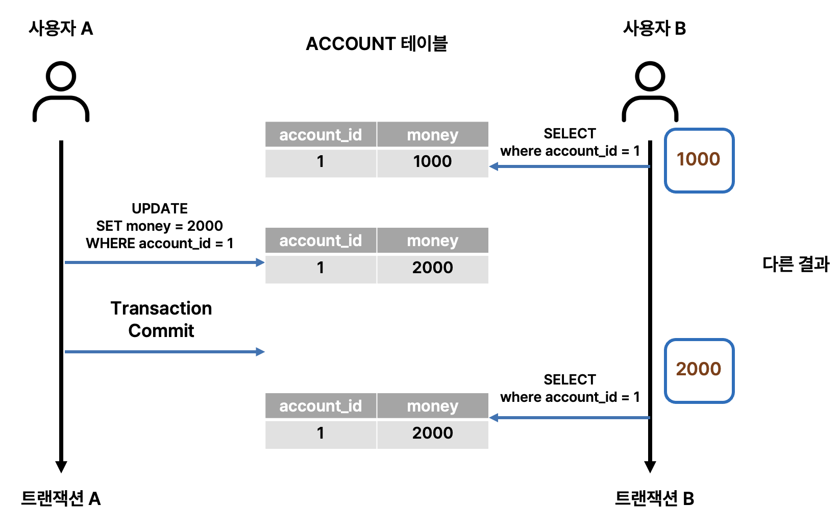 이때 트랜잭션 A의 변경 작업 커밋 이전과 이후의 결과를 보면 알 수 있듯이 조회 결과가 1000, 2000으로 다릅니다.