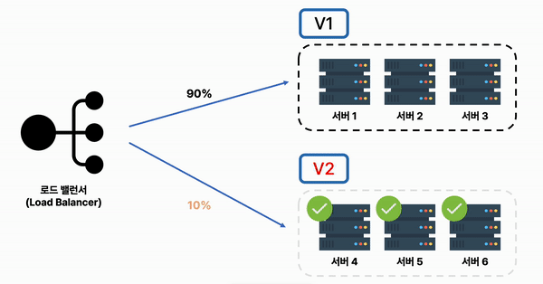 신버전 배포 시 구버전으로 향하던 트래픽을 점차적으로 신버전 서버로 향하도록 하는 방법입니다.