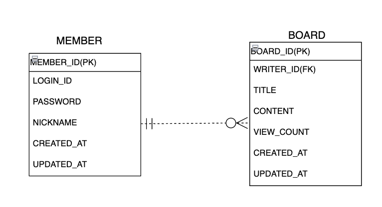 제 프로젝트에서는 다음과 같이 Member-Board가 1:N 관계였었습니다.