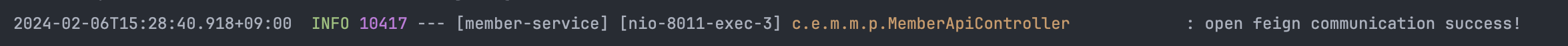 Member 서비스 Application의 로그를 확인해보면, 다음과 같이 Feign 통신이 정상적으로 성공함을 알 수 있습니다.