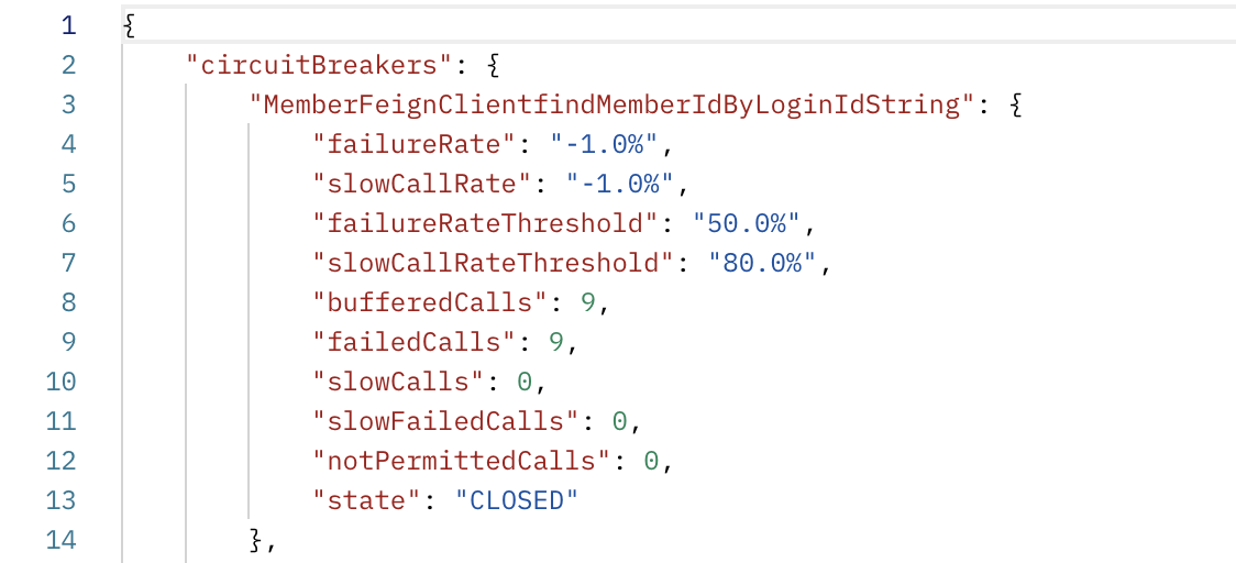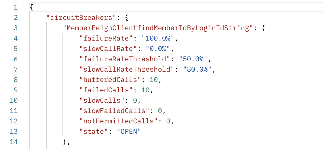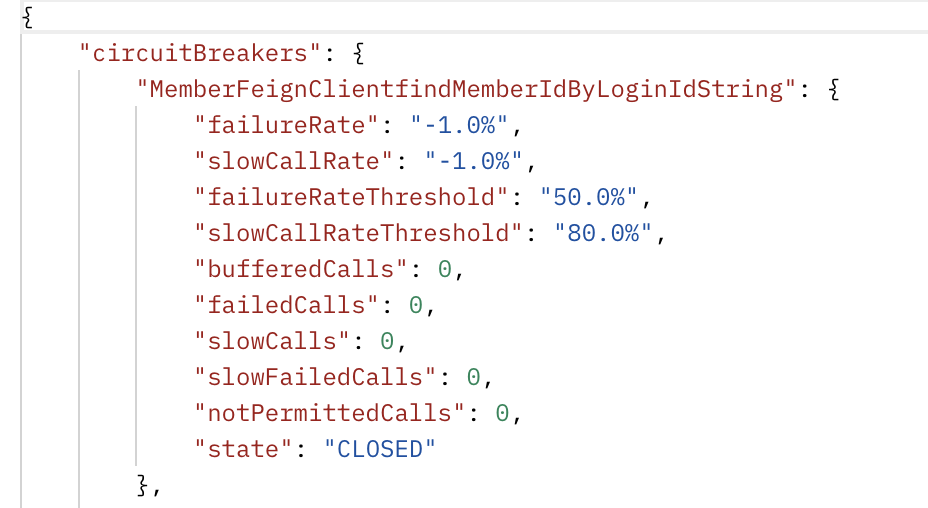 상태 체크는 위와 마찬가지로 {호출하는 서버 URL}/actuator/circuitbreakers로 체크합니다.