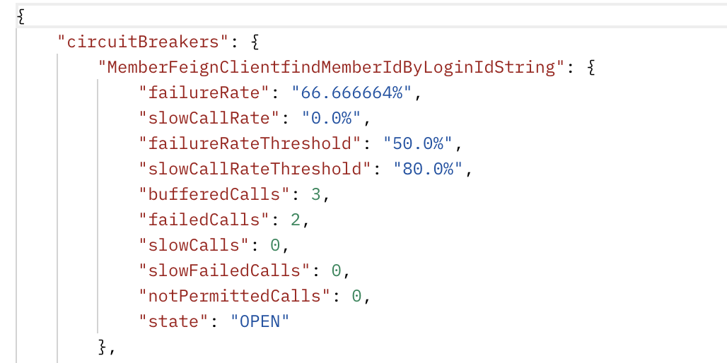 이때 failureRate가 66.6%로 failureRateThreshold보다 높기 때문에 OPEN 상태로 전환되는 것을 확인할 수 있습니다.