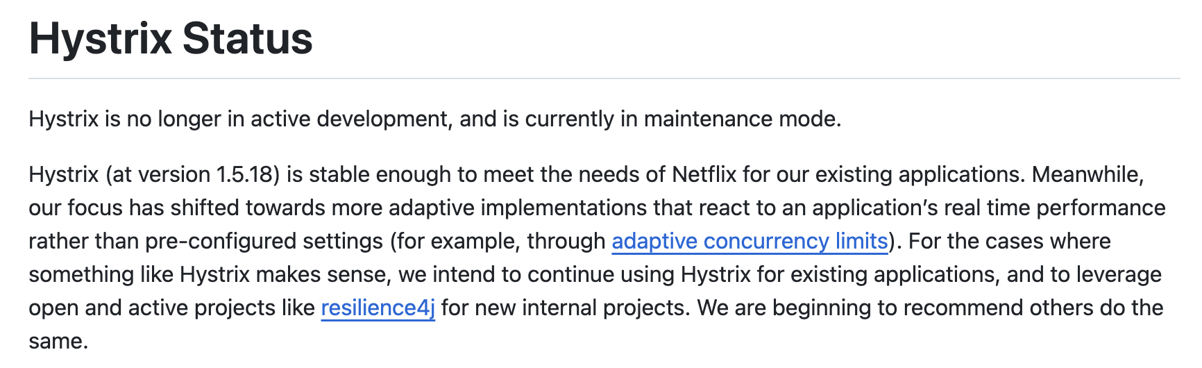 그러나, Hystrix 공식 Github Readme를 보면 더 이상 개발이 진행되지 않음을 알 수 있습니다.