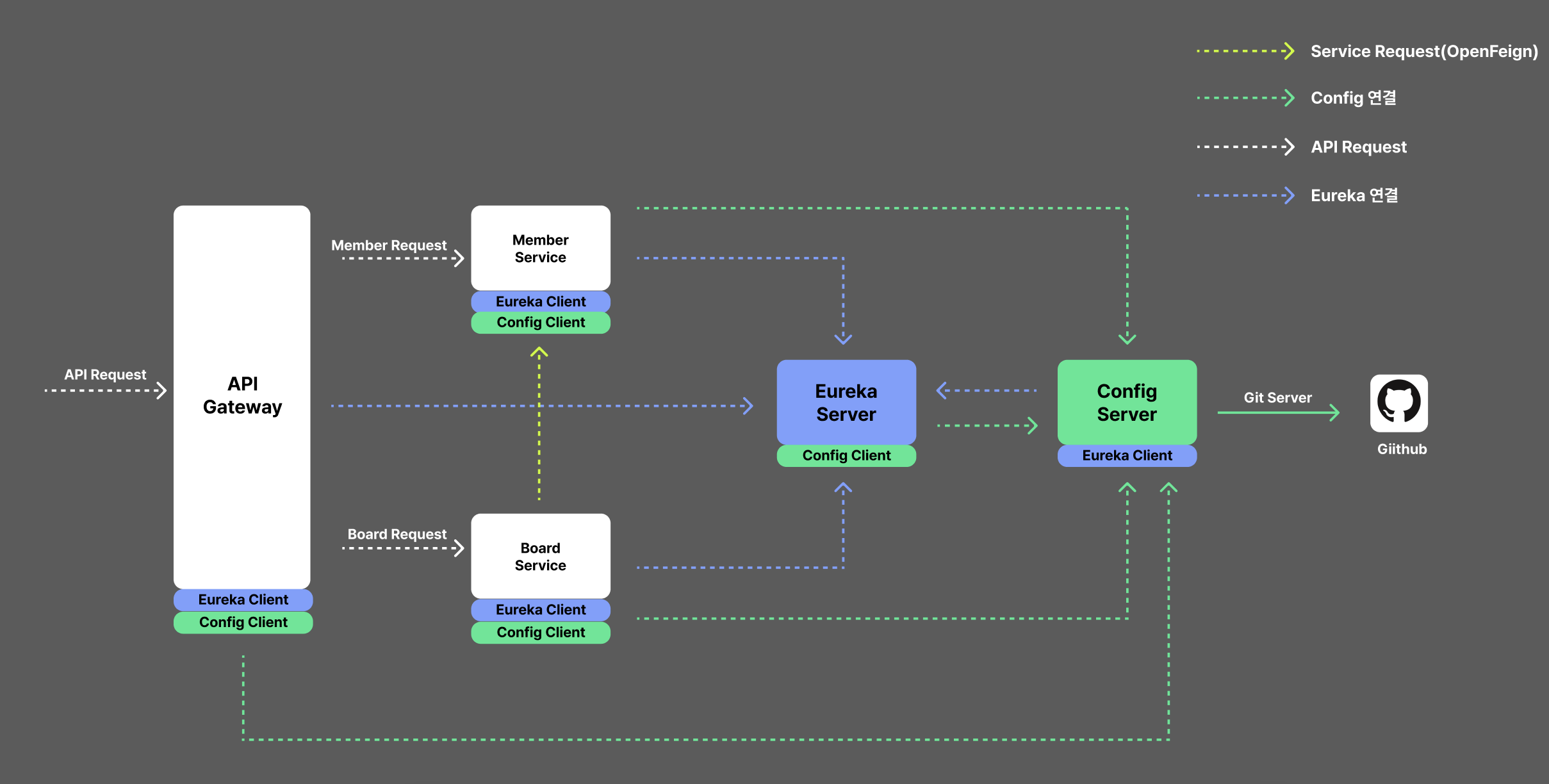 - Config Server에 각 마이크로 서비스의 프로필별 설정 파일 등록 (Github Private Repository에 등록 후 Load)