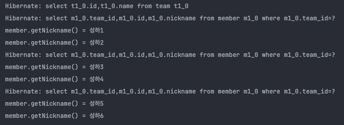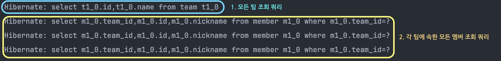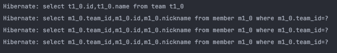 결과만 살펴보면, 모든 팀 조회 쿼리 1개와 각 팀에 속한 모든 멤버 조회 쿼리 3개가 발생하는 것을 알 수 있습니다.