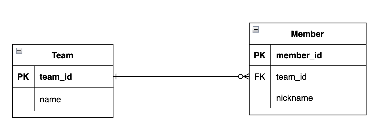 예시 엔티티는 가장 간단한 Team-Member 엔티티로 구성하여