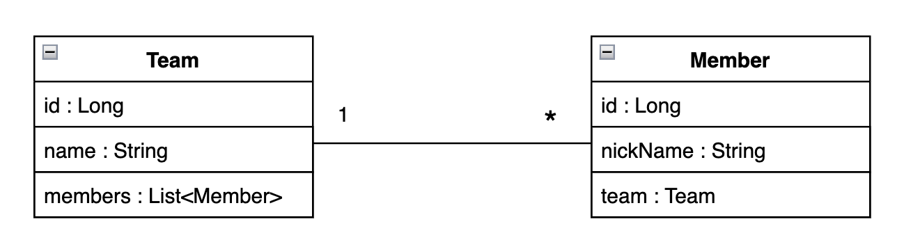 위와 같이 Team-Member 엔티티가 1:N 양방향으로 연관관계를 가진다고 가정하고 진행하겠습니다.