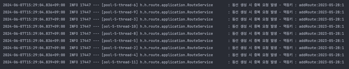 - 테스트 시나리오 : 같은 사용자가 같은 날짜의 총 10번의 동선 생성 요청을 동시에 보내는 상황