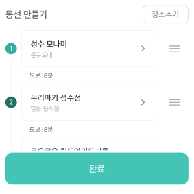 동선을 만들 때 위의 완료 버튼을 누르면 동선 추가 API 요청이 보내지도록 설계가 되어있었습니다.