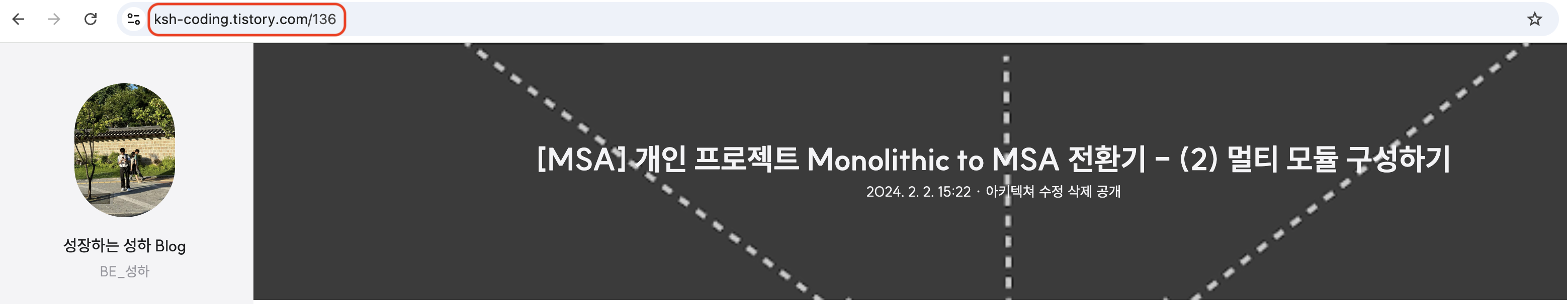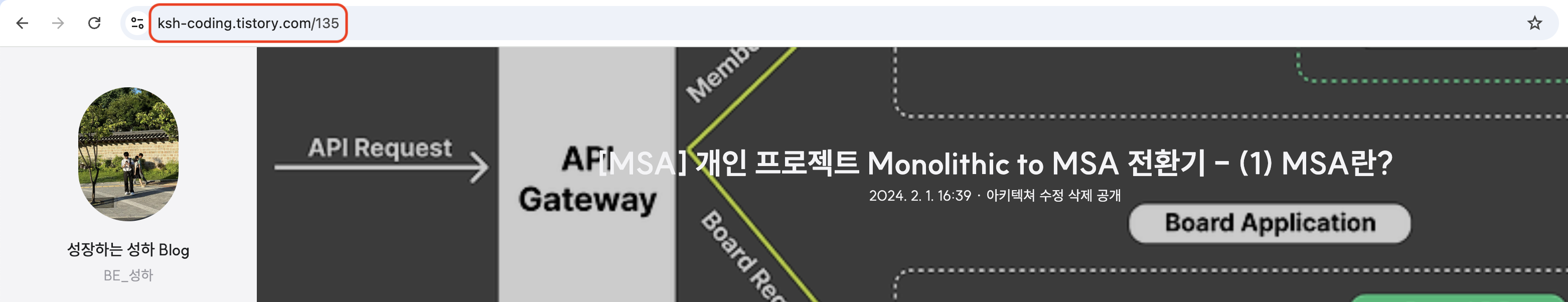 빨간 박스가 쳐진 URL을 살펴보면, tistory 도메인 뒤에 '135'인 글의 식별자를 발견할 수 있습니다.