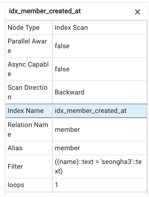 결과적으로 'name' 조건 컬럼의 INDEX가 아닌 'created_at' 정렬 컬럼의 INDEX를 통해 Scan을 하는 것을 알 수 있습니다.