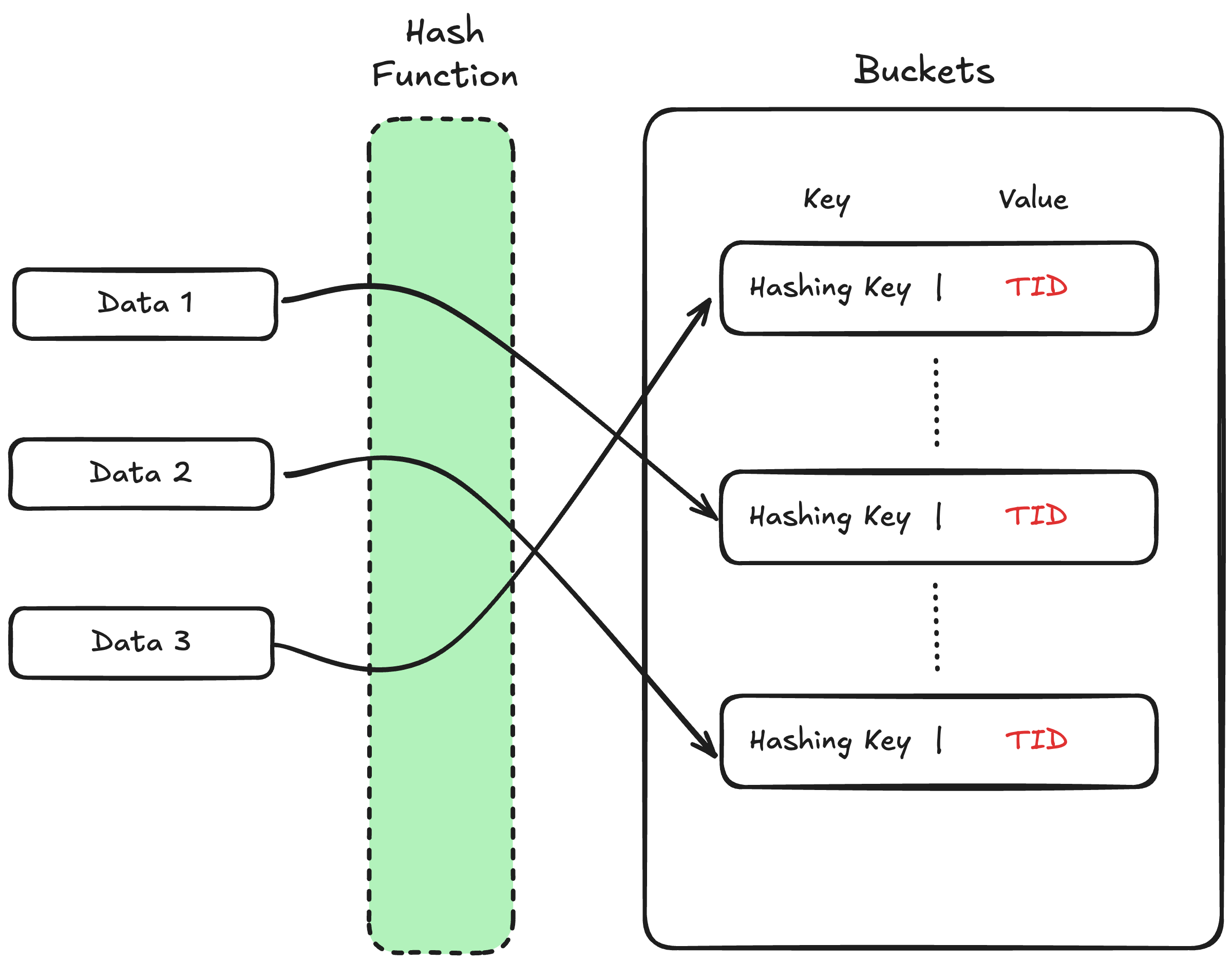 - Key-Value 형태로, Key는 해싱된 데이터 값을 의미하고 Value로는 해당 Tuple이 있는 TID를 가집니다.