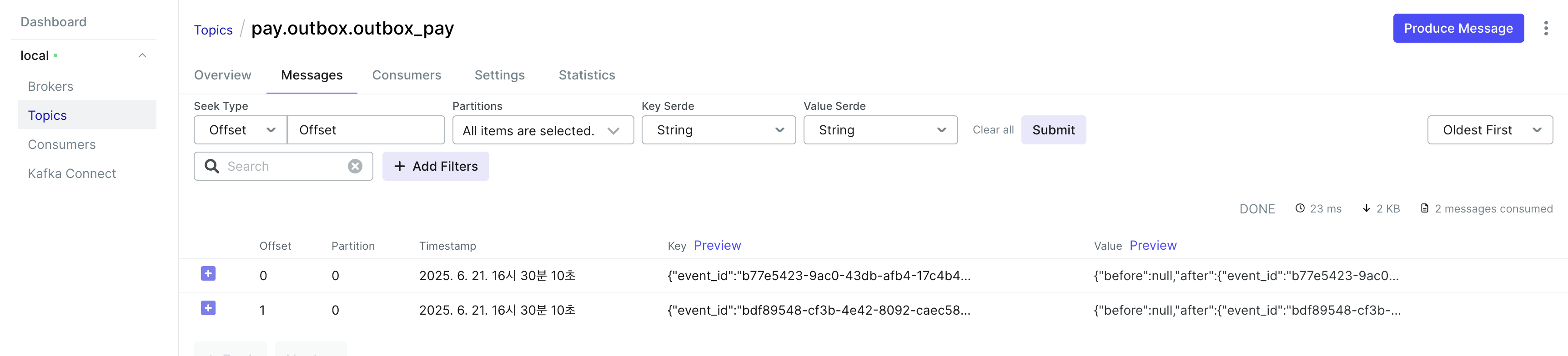 - 지정한 토픽(자동 생성 토픽)이 생성되었는지, 해당 토픽에 Outbox 테이블에 해당하는 메시지가 쌓이는지
