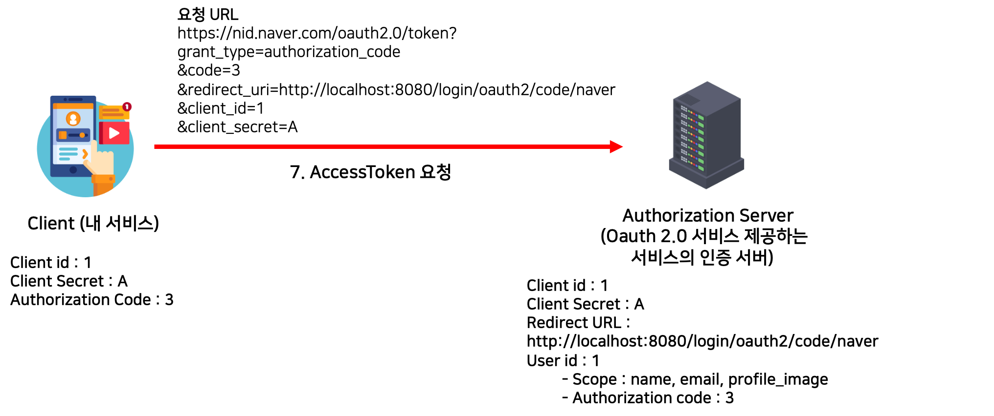 Authorization Server(네이버 인증 서버)가 Client(내 서비스)에게 권한 승인으로,