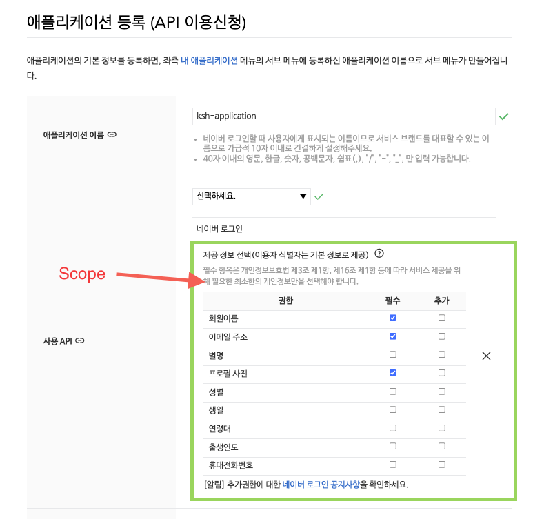 * Scope : 네이버(Resource Server)에서 사용하고자 하는 사용자의 정보