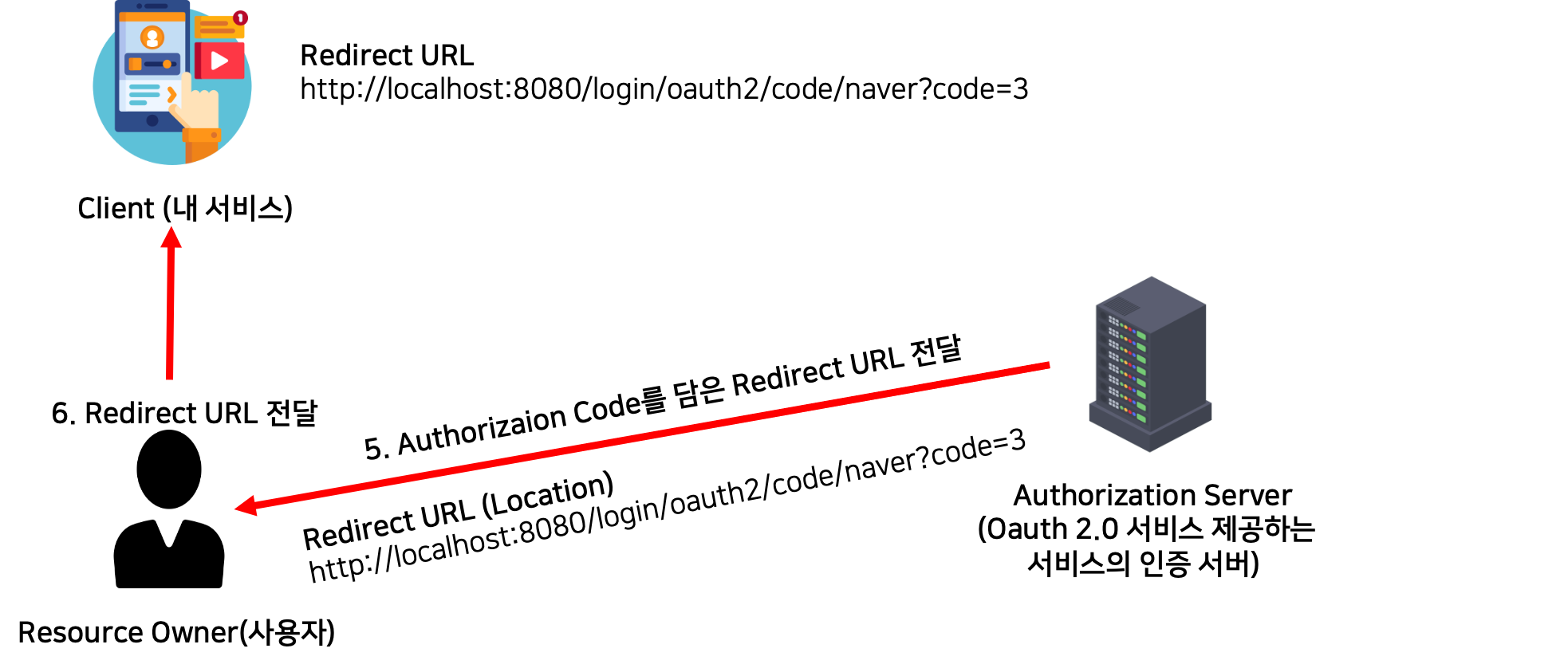 6. Client(내 서비스)는 Resource Owner(사용자)가 전달한 Redirect URL을 받는다.