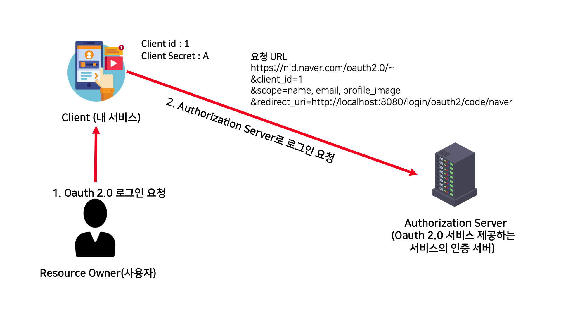 Client(사용자가 이용하려는 서비스)에서 Resource Owner(서비스를 이용하려는 사용자)를