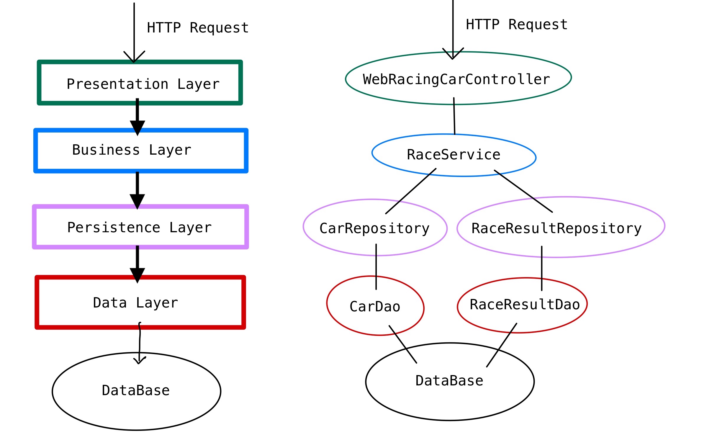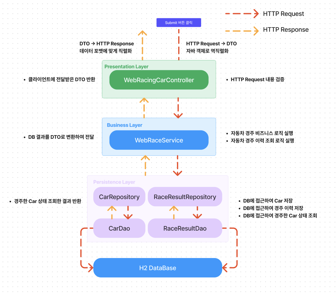 - '자동차 경주'라는 비즈니스 로직을 수행하고 Persistence Layer에 저장을 명령한다.