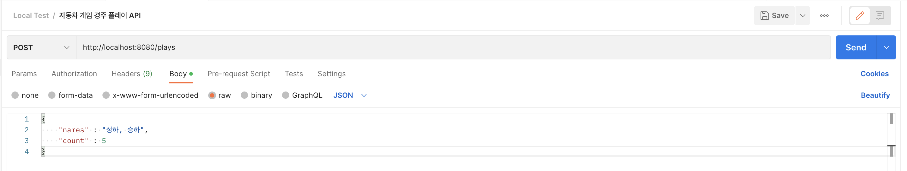 자동차 경주 플레이 API의 Request Body는 참가자 이름과 시도 횟수가 담긴 JSON이므로