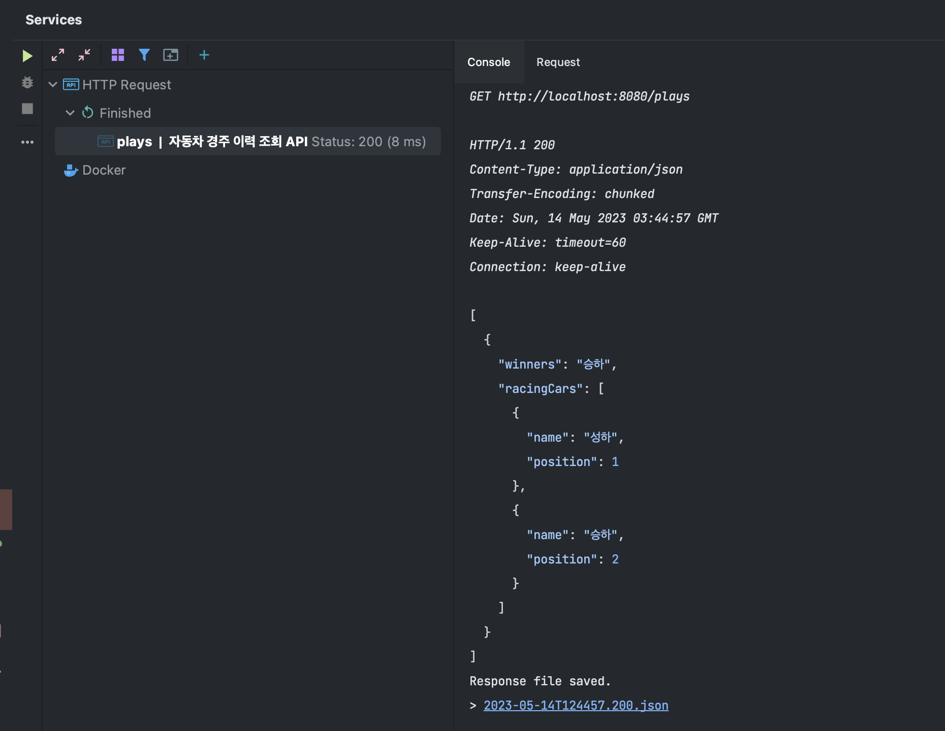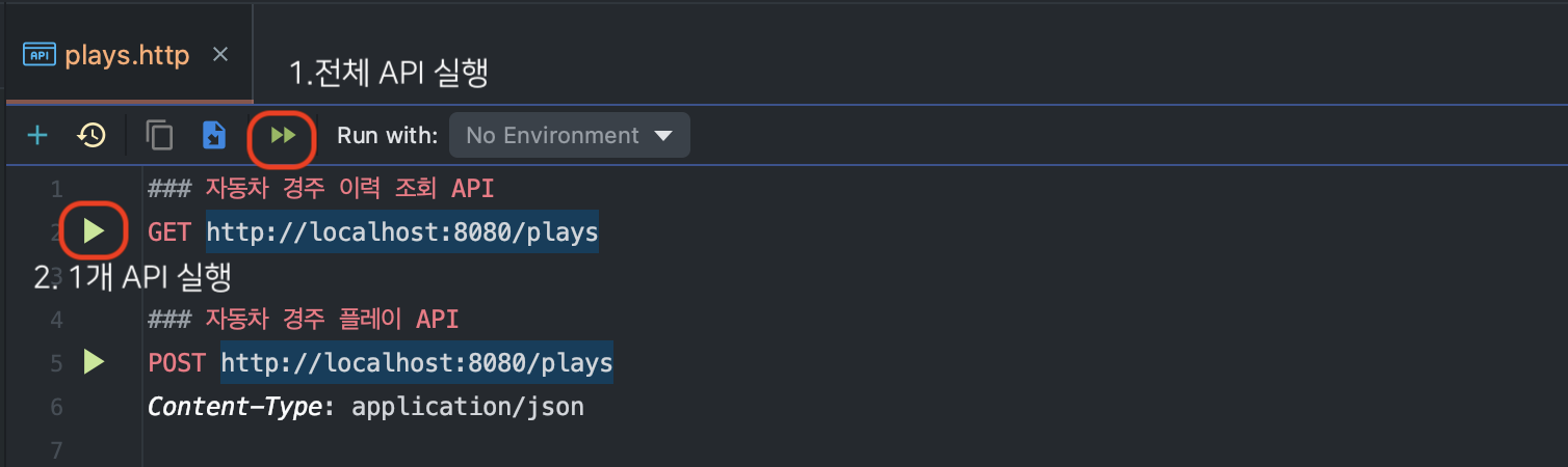 HTTP 요청 스펙 왼쪽의 실행 버튼을 누르면 해당 API만 실행된다.