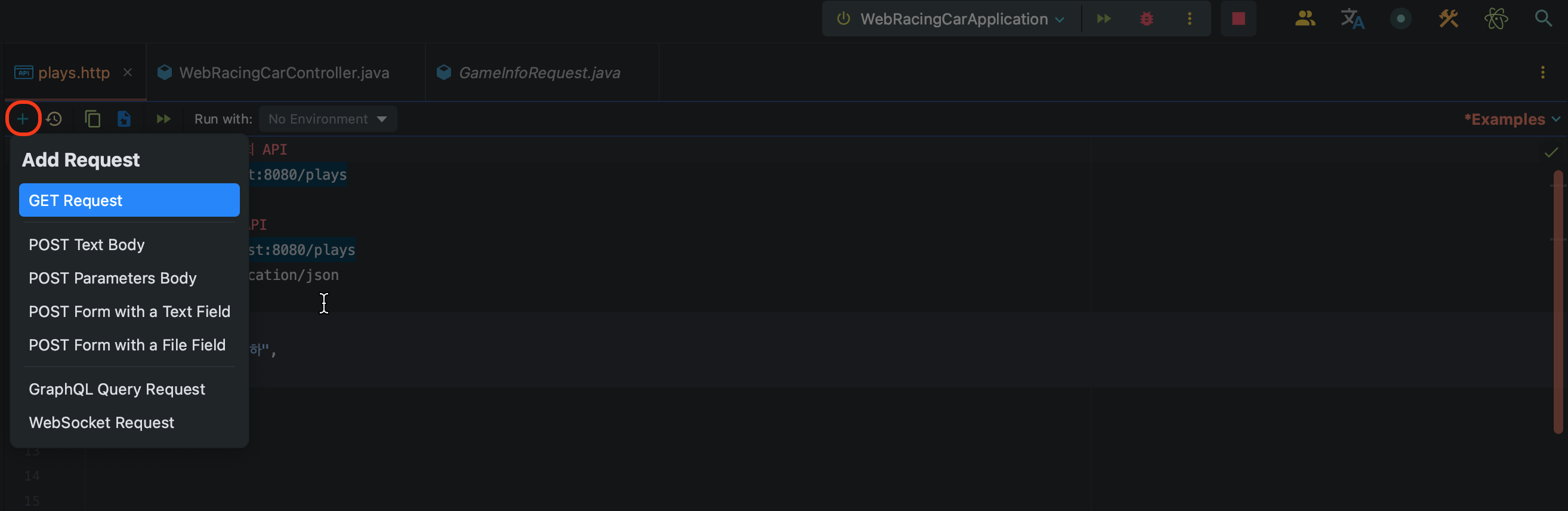 http 파일의 맨 왼쪽 위의 + 버튼(Add Request)을 누르면,