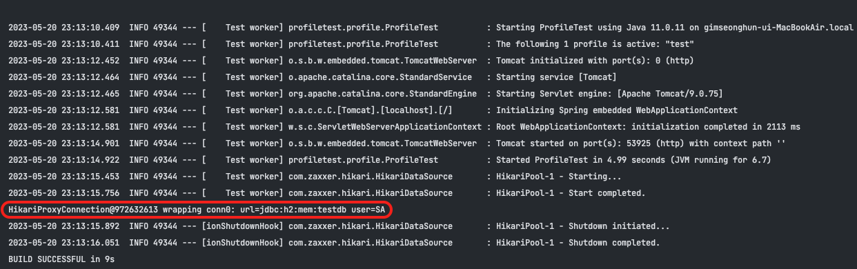 이때, 테스트 프로필에서 설정한 URL인 testdb가 나온 것을 알 수 있다.